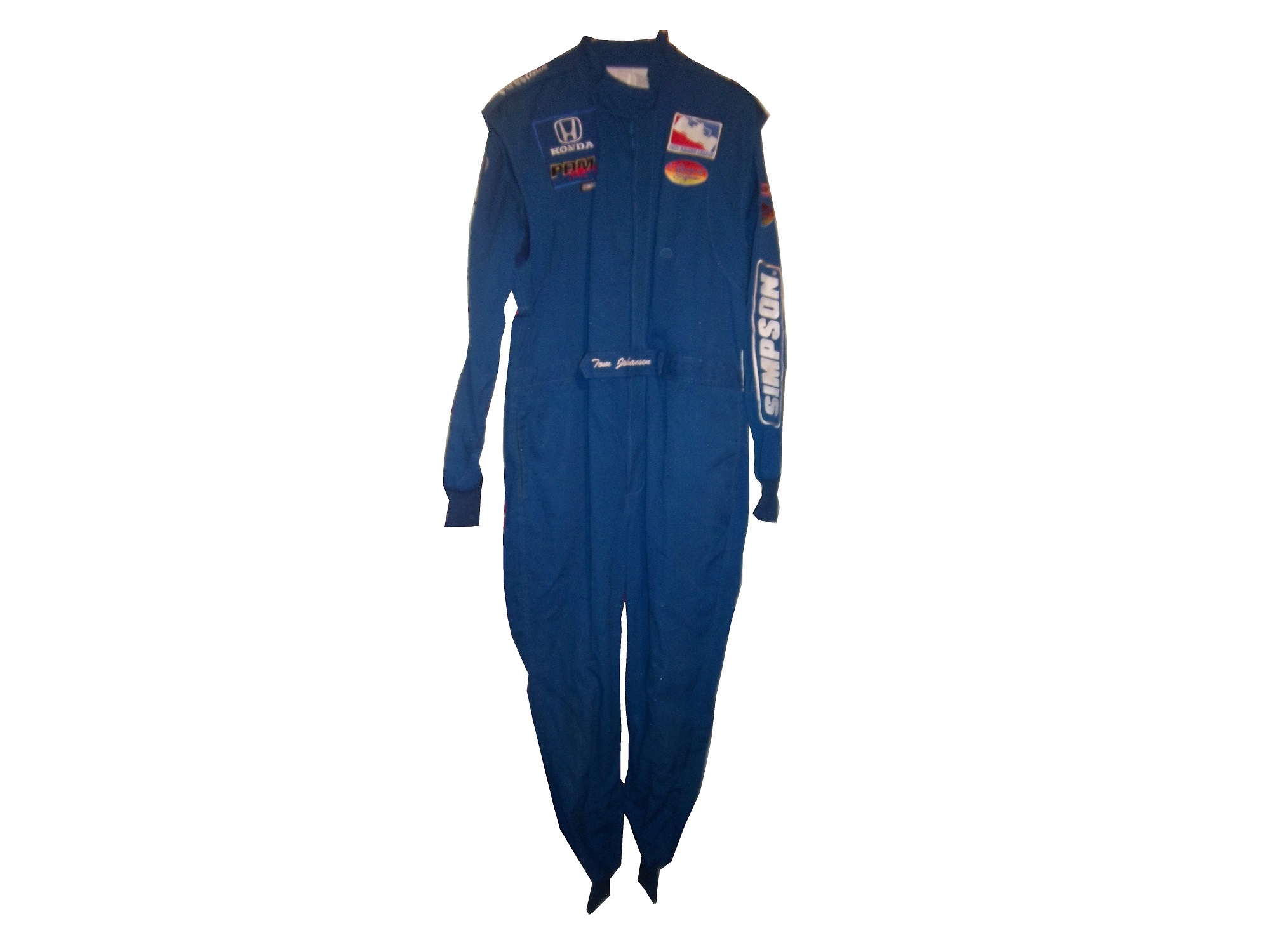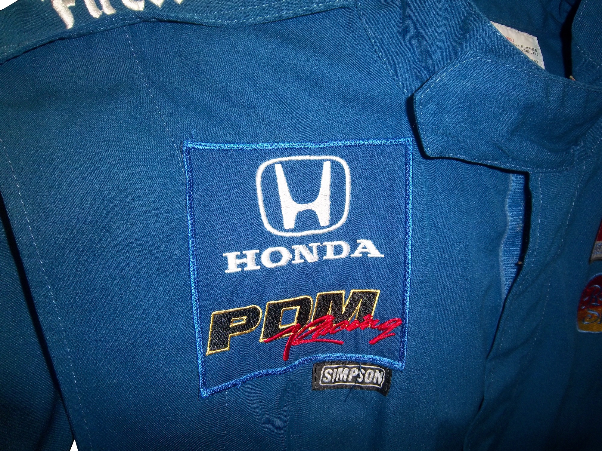 This particular suit was made for PDM racing, for use in the IndyCar Racing League in 2006. It was made for an individual by the name of Tom Johansen. It appears that Johansen is a crew member, and this suit was designed for his use. The logos are sewn on patches, the patches are placed on pieces of fabric, and then attached to the suit. From there, the suit starts to take shape, and the name is attached to the belt, and the logos are attached to the shoulder epaulets. In this example: