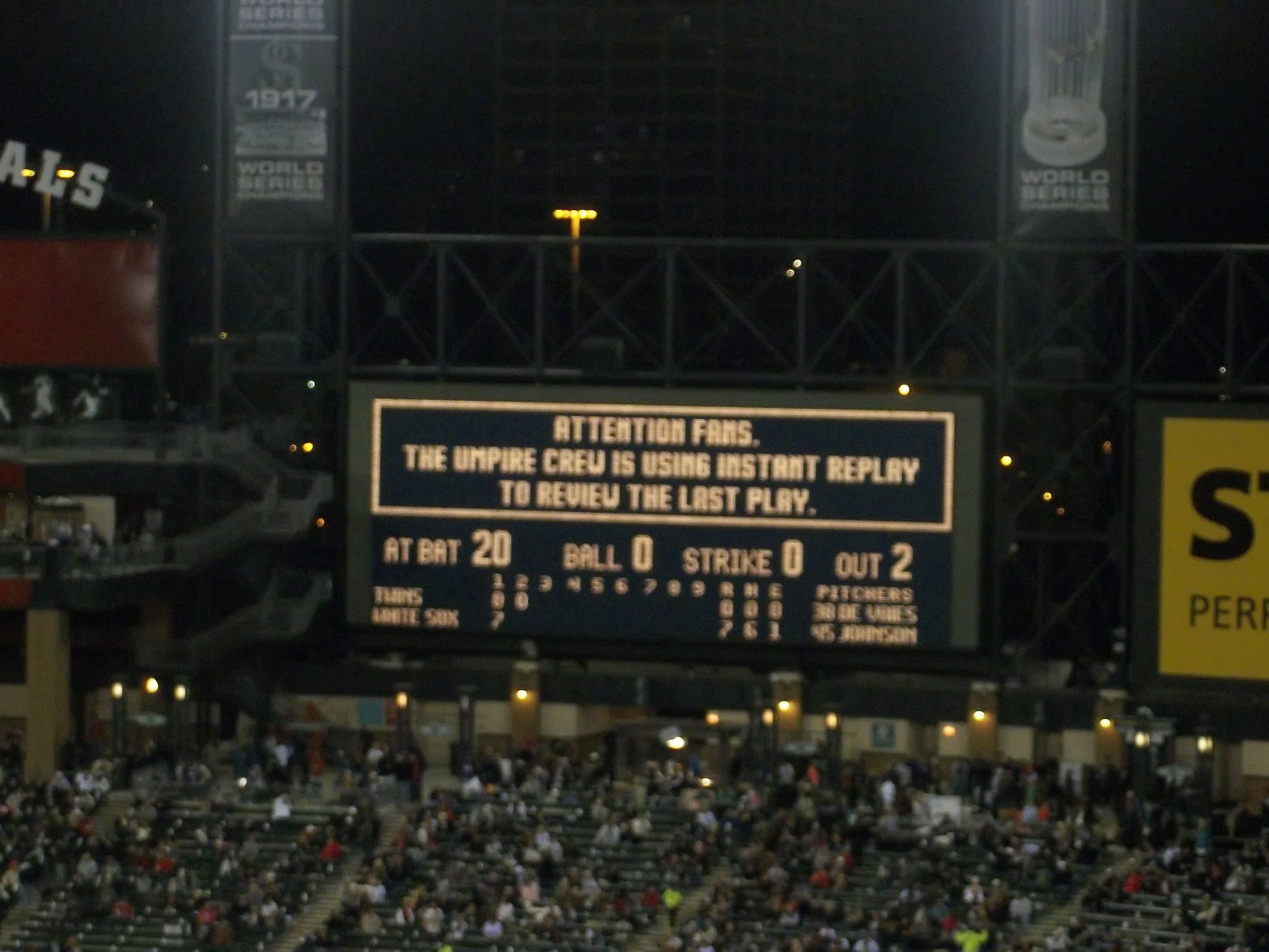, and waited for the game to begin. As I did, I looked around the stadium. The full moon over the stadium caught my attention, and I also noticed the scoreboards. For those who don’t know, the White Sox have the “exploding scoreboard” installed by Bill Veeck in 1960, which had a series of lit pinwheels that light up when a home run is hit. The scoreboard has become part of Sox lore, and when it was time to play ball, the scoreboard came to life.