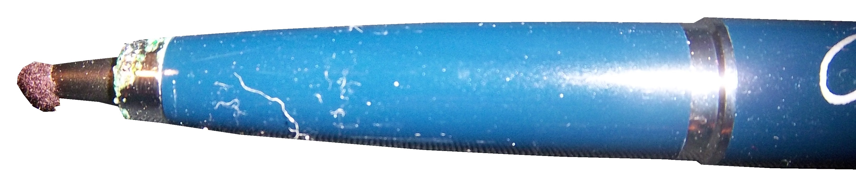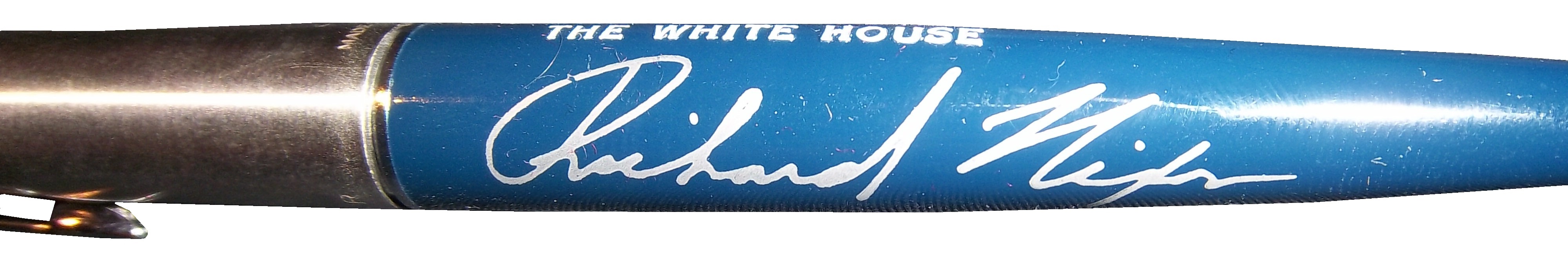 The pen is blue in color, and has Richard Nixon’s signature on the side of the blue plastic.