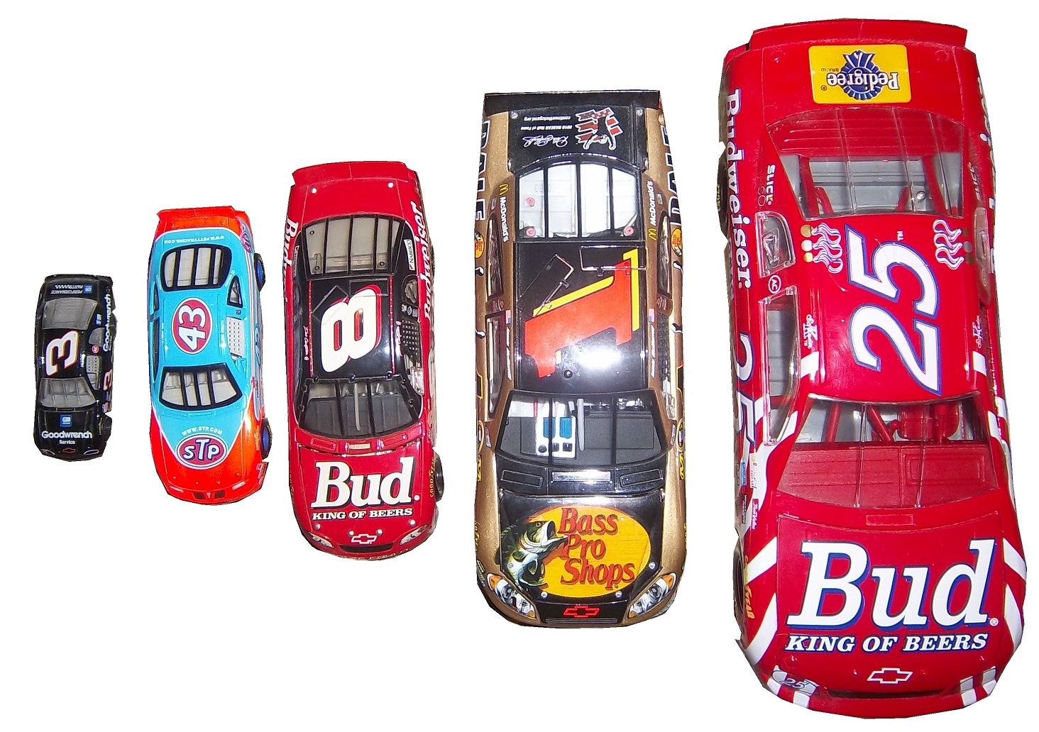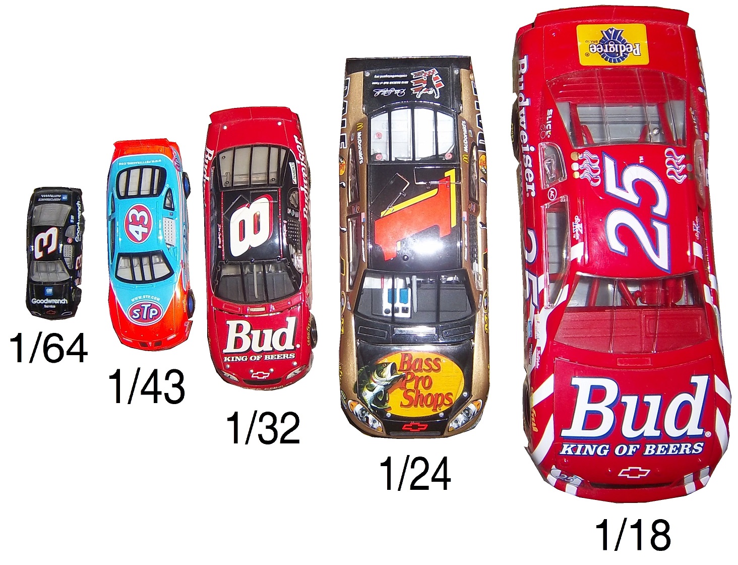 Race cars are a popular version of die casts, as most boys who love racing will buy the die cast of their favorite driver, and play with it as if they are driving the car. I’m guilty of this, as I’m willing to bet the majority of racing fans are, if you don’t believe, check this out. In the beginning, die casts were marketed and sold to kids, but as time went on, it became clear that grown up fans liked these as well. So die cast manufacturers began to create larger “adult collectibles,” typically in either 1:18 scale, or 1:24 scale, or one of the accepted G scales. The adult die casts will feature alcohol and tobacco sponsors, and are much more accurate in design, with cloth window nets, and working hoods, decklids, and roof spoilers. As time progressed, these cars gained a very dedicated following, and have become very profitable for NASCAR, IndyCar and F1. Interesting to note that the standard size for NHRA and NASCAR die casts is 1:24 and 1:64 whereas IndyCar uses 1:18 and 1:64 and F1 use 1:18 and 1:43. NASCAR die casts can also be purchased in 1:43, 1:32, and 1:18, here is how they compare to each other: