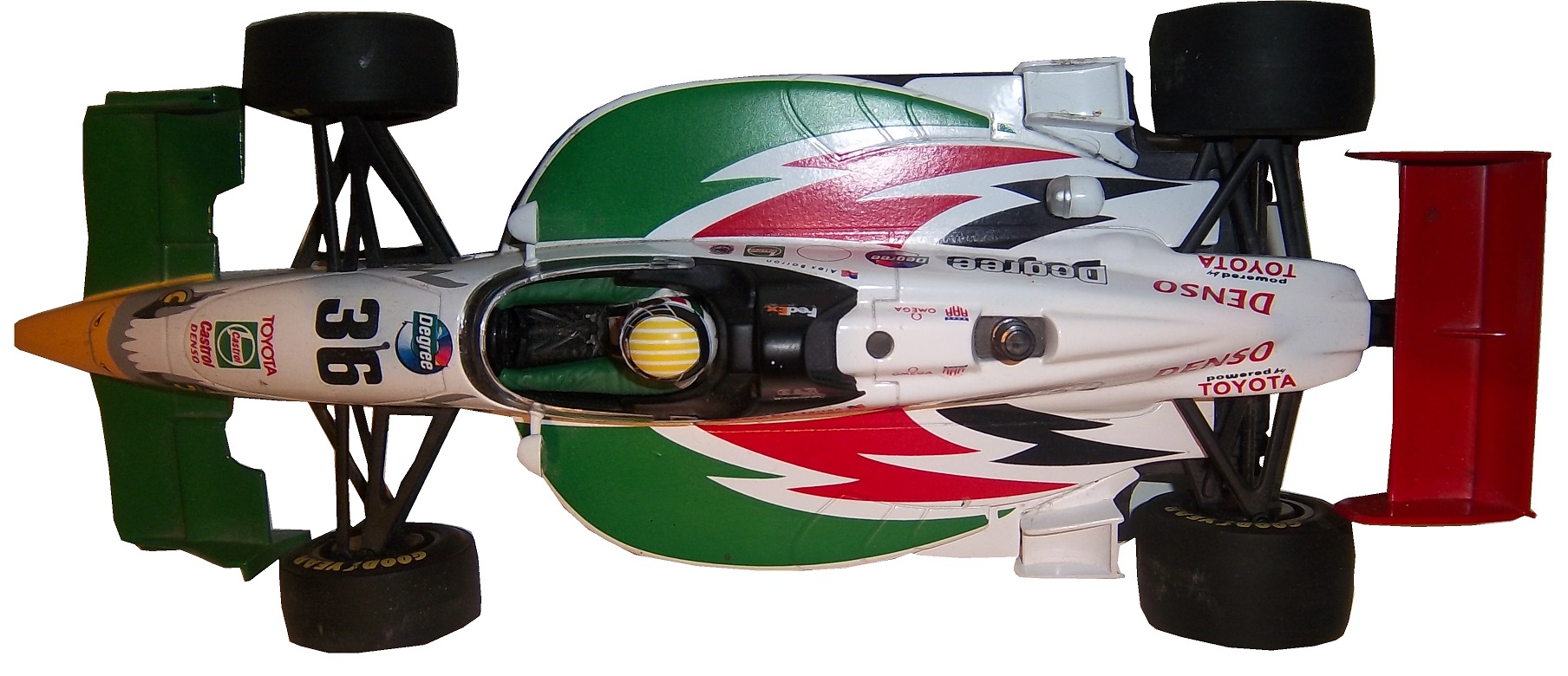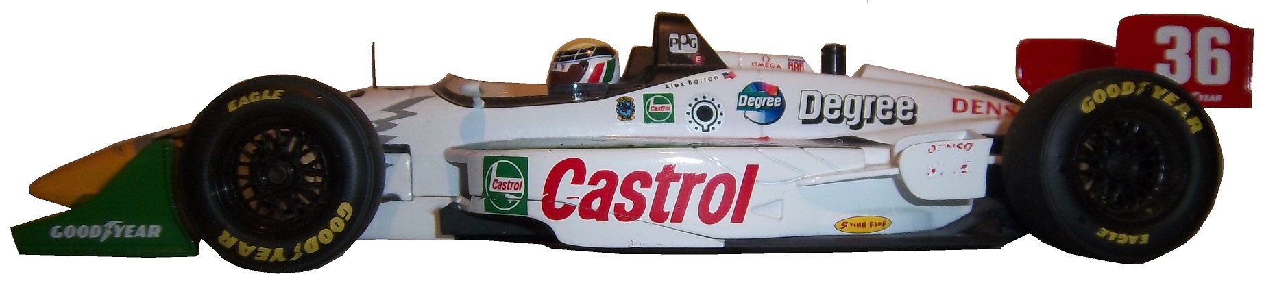 If we look at an IndyCar die cast, we see some different things. This example is an Alex Barron example from 1998, purchased because I have the matching driver suit. This particular die cast is a 1:18 scale, and features a working suspension that when you move the wheels move the steering wheel. Everything else about the car, including the helmet and driver suit are perfect as compared to the real car.