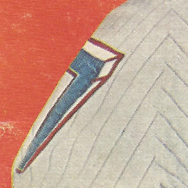 As can clearly be seen, the red bottom layer is made of tackle-twill, which was and still is one of the most popular materials for baseball uniform numbers. The middle layer is the same cream-colored lightweight flannel that the uniforms themselves were made of. The top layer is a blue tackle-twill design, to give the 3D appearance. The uniform was featured in the 1958 Warner Brothers musical Damn Yankees, and the numbers can clearly be seen in the Shoeless Joe from Hannibal MO scene as seen here: