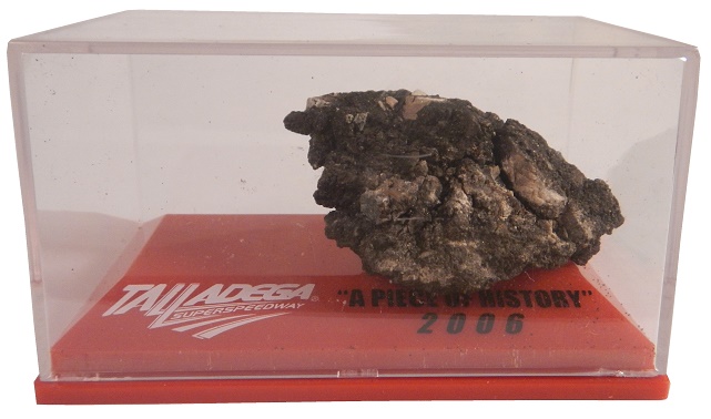 The entire 2.5 mile surface was removed and the track repaved. The old track was cut into pieces and sold to fans. This is an example of one of those pieces. It is 3 inches by 2 inches, about a third of an inch thick, and has a small plaque on it commemorating that it came from the track.
