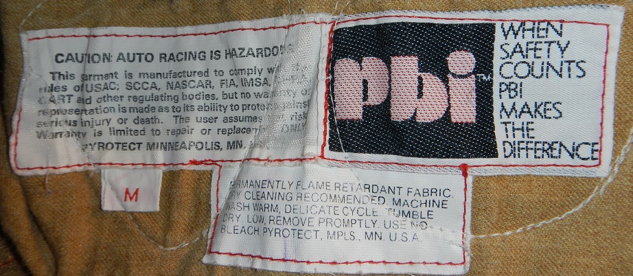 Fire is an ever present threat in auto racing, including auto racing school. Skip Barber issued suits to their students. These were lightweight, and were inexpensive. This 1980’s-1990’s Pyrotect suit is one example. The suit does show decent use, not surprising for a lightweight suit.