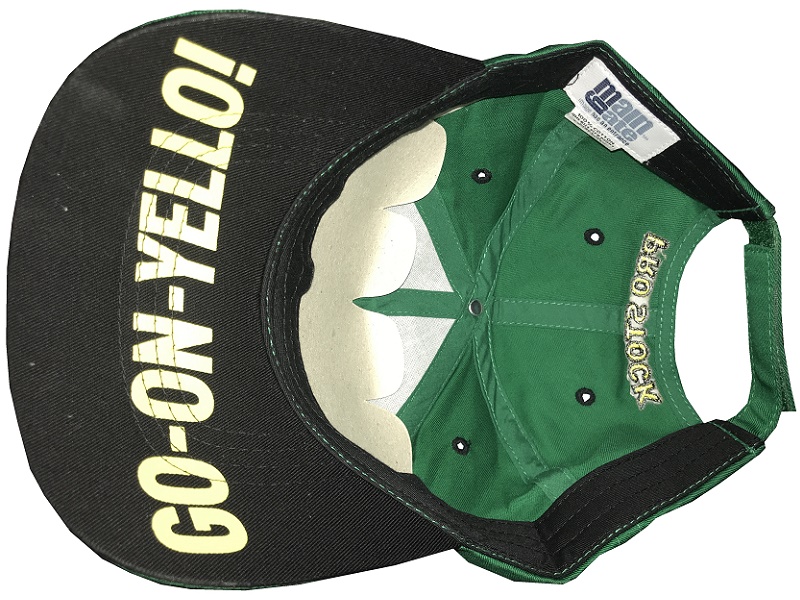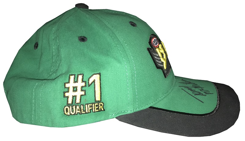2014 saw some minor changes. It’s basically the same design, with a few differences. First, the black font on the brim has been replaced by white with black outlines. The phrase Go On Yello has been added to the under side of the bill, and the right side of the cap in the same font as 2014. Finally, the holes and squatchee have changed color from the color of the cap to black. This Shane Gray #1 Pro Stock is one example. The #1 Qualifier logo replaces the winner patch on the sides.
