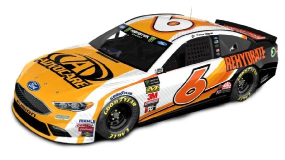Trevor Bayne #6 Ford EcoBoost Ford Fusion–New scheme for 2018, black replaces red, more toned down, with white rear. B+