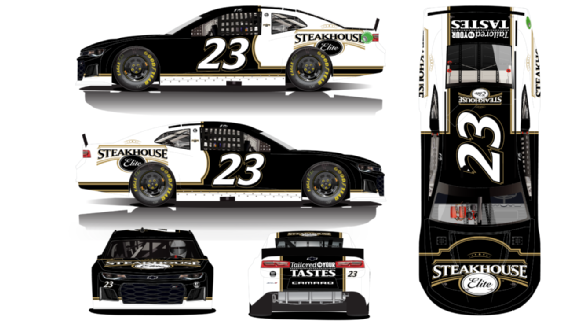 JJ Yeley #7 Steakhouse Elite Chevy Camaro-New sponsor for 2018, black camo front, gold stripes, white rear. B-