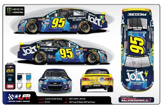 Michael McDowell #95 Jolt Eye Drops Chevy SS-New sponsor for 2017, blue with mountain motif across car. A