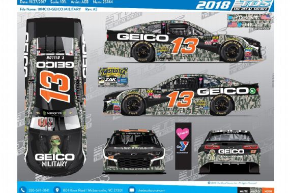 B.J. McLeod #53 Enlisted Nine Flight Company Chevy Camaro-New sponsor for 2019, airplane motif across car. A