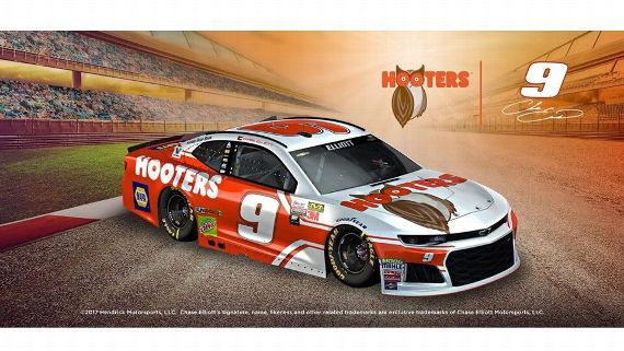 Chase Elliott #9 Hooters Chevy CamaroNew scheme for 2018, orange back and white front, with Y design across sides. B-