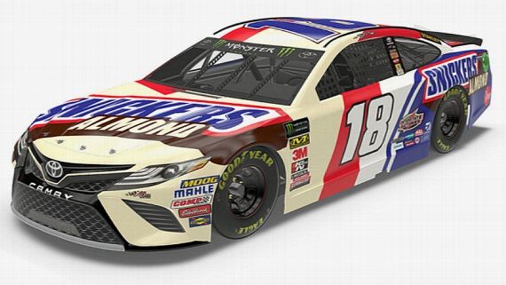 Kyle Busch #18 Snickers Almond Toyota Camry-New sponsor for 2018, red, white and blue with large stripes on sides. F