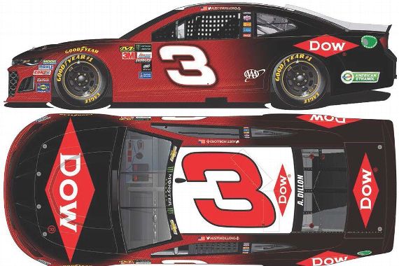 Austin Dillon #3 Dow Silastic Silicone Elastomers Chevy Camaro-New sponsor for 2018, white with liquid motif on front, and yellow field motif on rear. A
