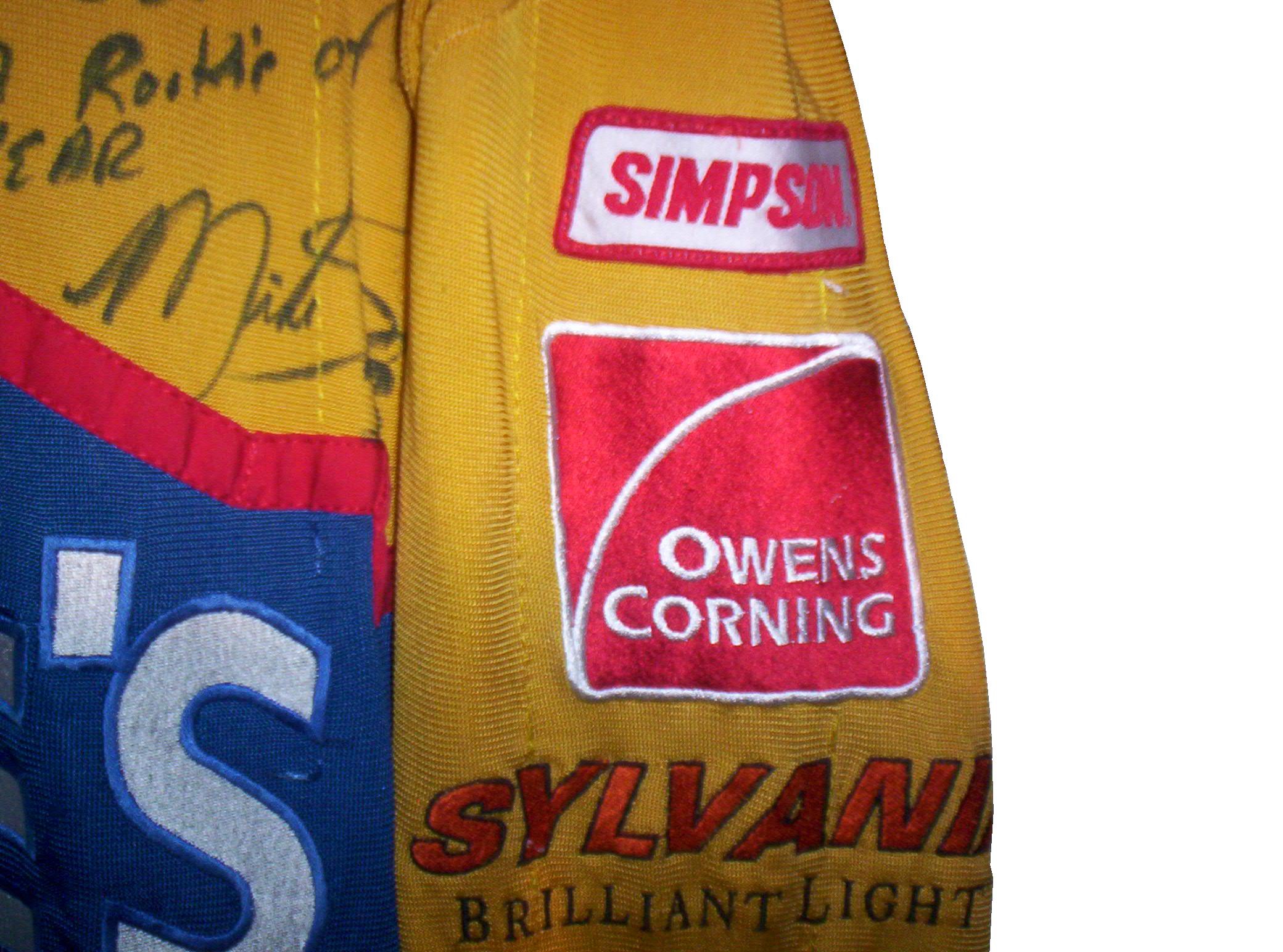 The triple-layer suit is custom designed for Sedgwick, with the Sears Die Hard logos on the collar and shoulder epaulets,