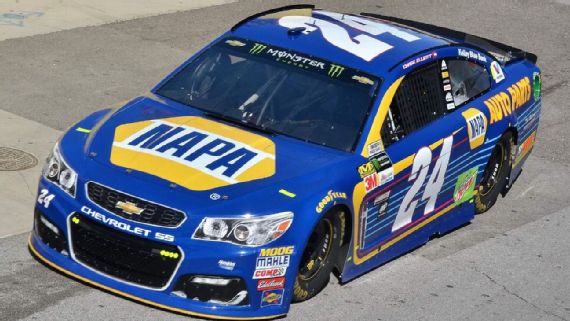 Chase Elliott #9 NAPA Chevy Camaro–New scheme for 2017, blue with white designs on sides. B+