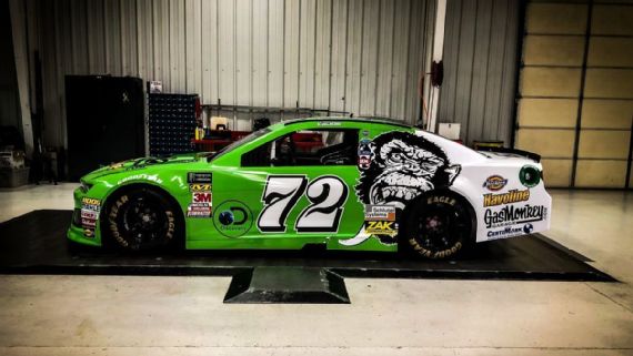 Corey LaJoie #72 Gas Monkey Garage Chevy Camaro-New sponsor for 2018, green front, white rear, monkey logo between the two. A