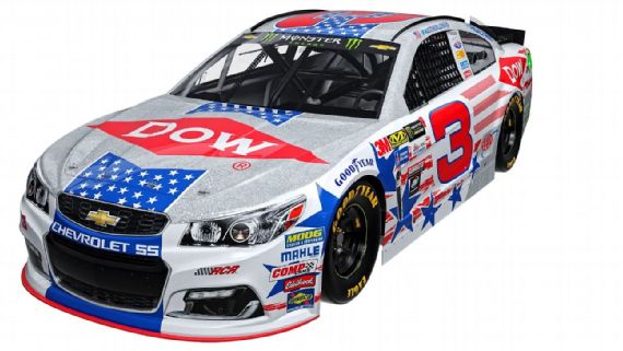 Austin Dillon #3 Dow Patriotic Chevy SS–New scheme for 2017, silver with blue star motif across hood, stars and stripes patterns on sides. A